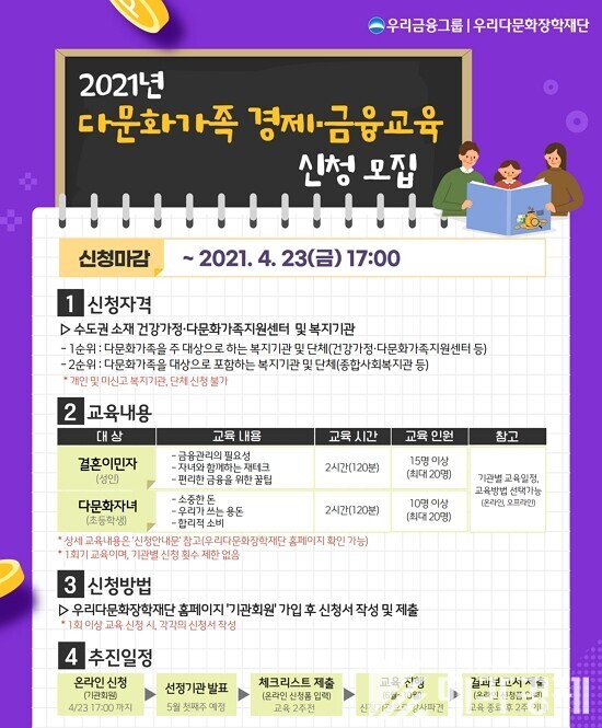 우리금융지주 우리다문화장학재단(이사장 손태승)은 ‘2021년 다문화가족 경제.금융교육’에 참여할 다문화가족 지원기관을 모집한다고 18일 밝혔다.
