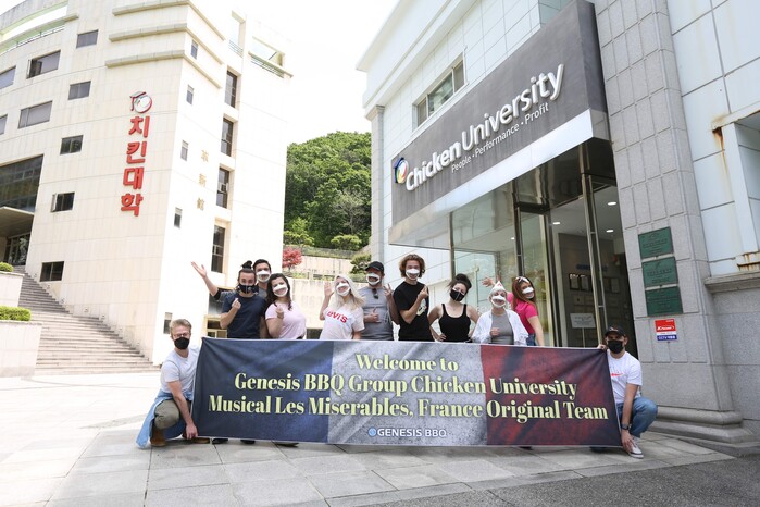 제너시스 비비큐(회장 윤홍근)는 평소 한국 치킨을 자주 즐겼으며, 특히 BBQ치킨을 극찬하고 '최애치킨'이라고 밝힌 레미제라블 내한팀의 소식을 듣고 이들을 치킨대학에 초청한 것.