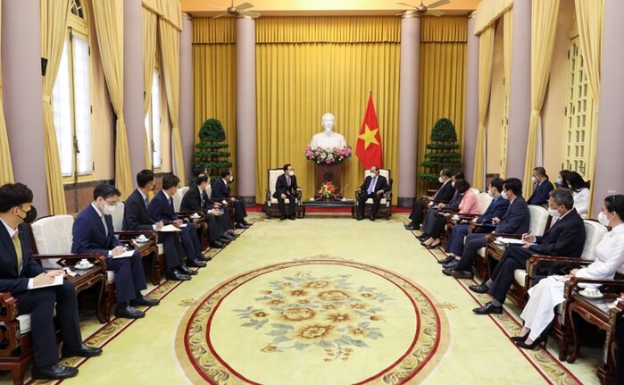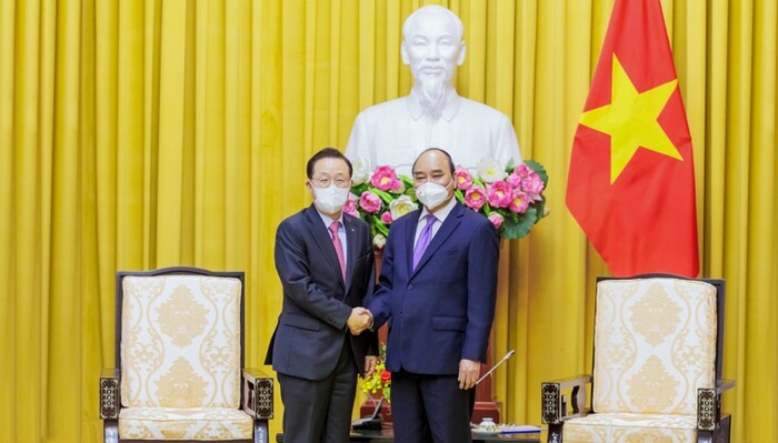 이에 응우옌 쑤언 푹 주석은 베트남에 진출한 한국기업들의 애로사항을 해결하기 위해 노력할 것을 약속하면서, “올해로 한·베트남 수교 30주년을 맞아 한국기업들의 더 많은 진출과 투자를 기대하고, 특히 부품소재산업 중소기업들의 활발한 진출을 위해 양국이 더욱 돈독한 협력관계를 구축하기를 희망한다”고 화답했다.