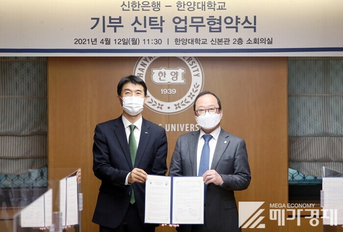 신한은행(은행장 진옥동)은 한양대학교와 ‘신한 Life Care 기부 신탁’을 통해 후학양성과 기부 문화 확산에 상호 협력하는 업무협약을 체결했다고 13일 밝혔다.