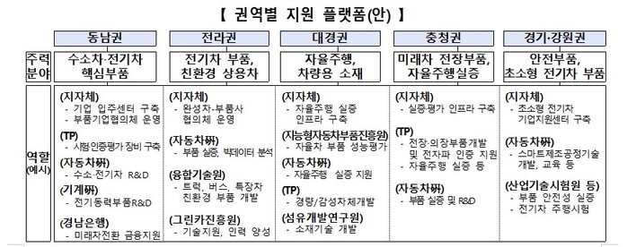 5개 권역별 주력분야를 살펴보면, ▲동남권은 수소차·전기차 핵심부품 ▲전라권은 전기차 부품, 친환경 상용차 ▲대경권은 자율주행, 차량용 소재 ▲충청권은 미래차 전장부품, 자율주행 실증 ▲경기·강원권은 안전부품, 초소형 전기차 부품 등으로 나뉜다.