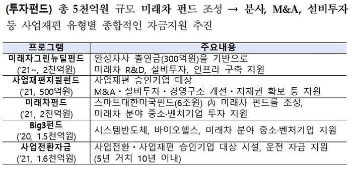 아울러 총 5000억원 규모의 미래차 펀드를 조성해 분사, M&A, 설비투자 등 사업재편 유형별 종합적 자금지원을 추진한다는 복안이다.