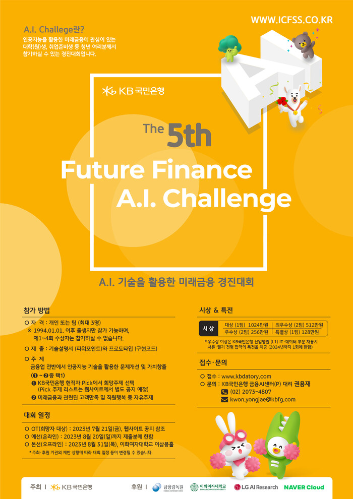 지난 2019년부터 시작된 퓨처 파이낸스 A.I. 챌린지는 AI(인공지능)을 활용한 미래금융 아이디어를 확보하고 우수 인재들의 관심을 높이고자 열리고 있다. KB국민은행이 주최하는 이 대회는 금융감독원과 이화여자대학교·네이버클라우드·LG AI연구원 등에서 후원한다.