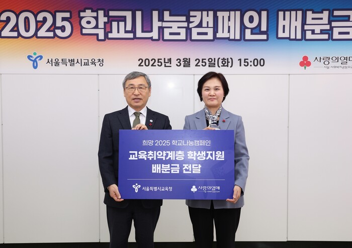 [메가경제=이동훈 기자] 서울 사회복지공동모금회(회장 김재록, 이하 서울 사랑의열매)는 서울시교육청(교육감 정근식)에 ‘희망2025 학교나눔캠페인’을 통해 모인 성금 약 1억 9천만 원을 전달했다고 밝혔다.