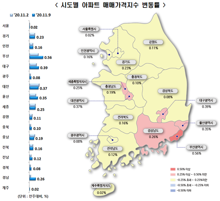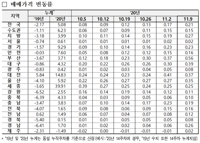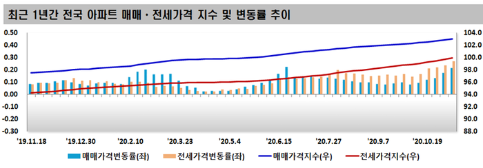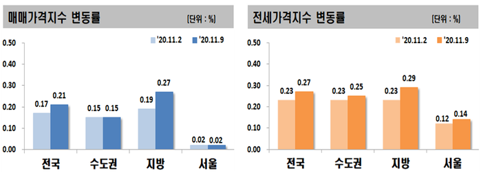 한국감정원은 11월 둘째 주 전국 주간 아파트 가격 동향을 조사한 결과, 매매가격은 0.21% 상승했고 전세가격은 0.27% 올랐다고 밝혔다.