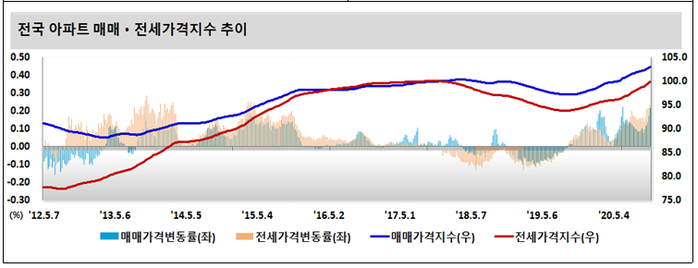 | ▲ 최근 1년간 전국 아파트 매매가격과 전세가격 지수 및 변동률 추이. [출처= 한국감정원] |