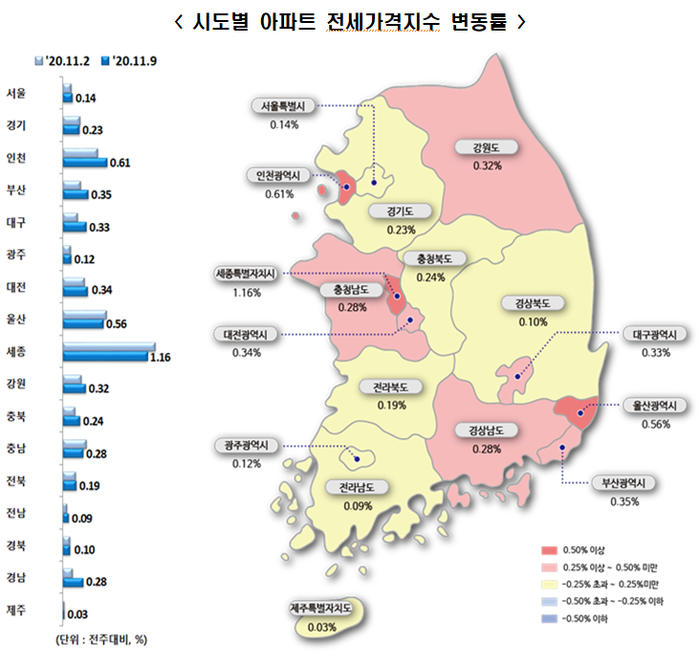 | ▲ 시도별 아파트 전세가격지수 변동률. [출처= 한국감정원] |