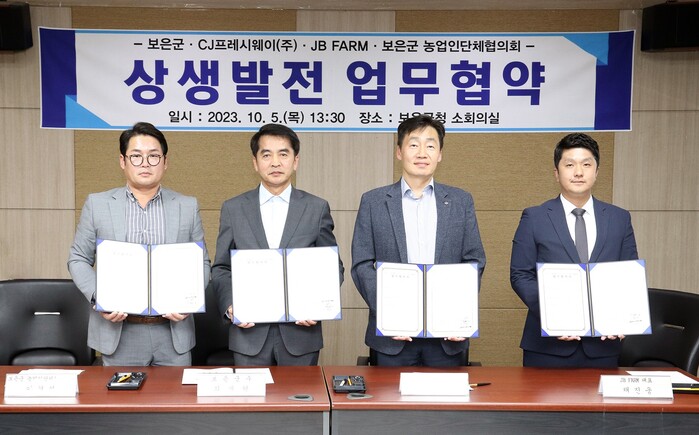 CJ프레시웨이는 보은군청에서 최재형 보은군수와 이형석 보은군 농업인단체협의회장, 채진웅 제이비팜 대표와 보은군 농업의 발전과 농산물 유통 활성화를 위한 협력 계획을 공유했다.