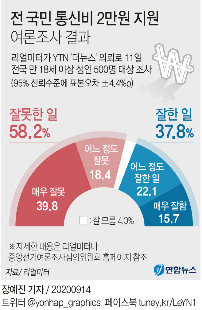 ▲ 리얼미터가 지난 11일 조사, 14일 발표한 결과에 따르면 전체 응답자의 58.2%가 전 국민 통신비 2만원 지원이 '잘못한 일'이라고 평가했다. [그래픽= 연합뉴스] |