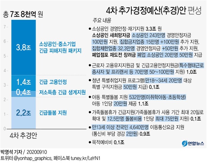 이번 4차 추경안의 주요 내용을 보면, 소상공인 중소기업 긴급 피해지원 패키지에 3조8천억원, 긴급고용안정에 1조4천억원, 저소득층 긴급 생계지원에 4천억원, 긴급돌봄 지원에 2조2천억원 등이다.