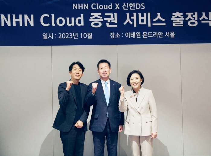 ▲ 왼쪽부터 김동훈 NHN클라우드 공동대표, 김상태 신한투자증권 대표, 조경선 신한DS 대표. [사진=NHN클라우드] |