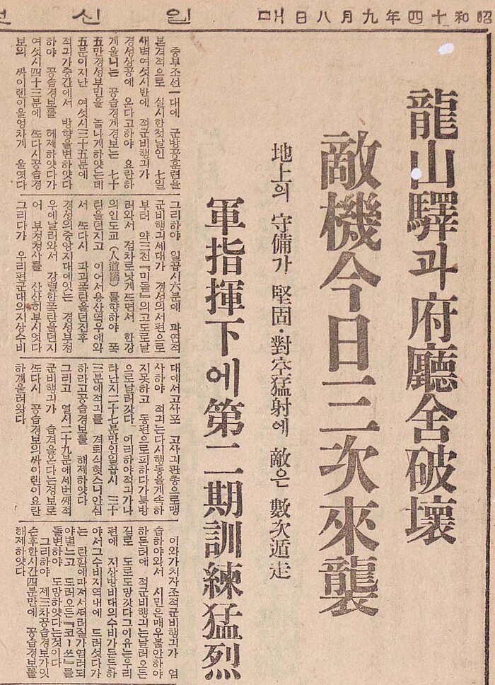 필자는 최근 1939년 9월 8일 매일신보에서 적기가 3회나 내습하여 용산역을 파괴했다는 기사를 접하고, 이때는 제2차 세계대전 기간(1939 .09.01.~1945.09.02.)으로 당시 신문에서 말하는 아군은 독일, 이탈리아, 일본이었으며, 적국은 영국, 프랑스, 미국, 소련, 중국 등 연합국이었으므로 용산역사는 제2차 세계대전 중 연합국 측의 비행기에 의하여 폭파된 한국의 건물이었음이 확인된다.