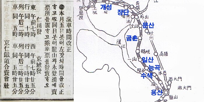 | ▲사진 좌부터 1900.9.1.황성신문과 경의선 용산~개성 노선도 |