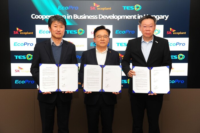 SK에코플랜트는 16일 서울 종로구 수송동 본사에서 국내 1위 배터리 양극재 기업 에코프로, 자회사 전기·전자폐기물(E-waste) 전문기업 '테스'와 함께 '헝가리 배터리 재활용 사업 협력'을 위한 업무협약(MOU)을 체결했다.