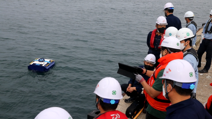 | ▲ 지난해 9월 쉐코가 해양환경공단, SK이노베이션과 함께 쉐코 아크-M을 가동해 해양 오염물질 제거 성능을 확인하고 있다. [사진=SK이노베이션] |