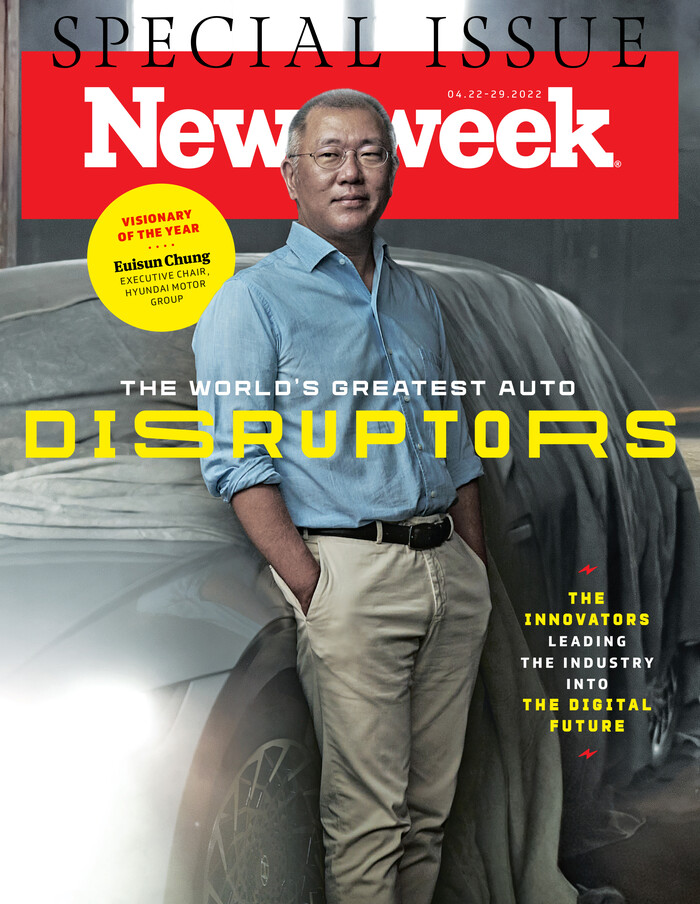| ▲ 뉴스위크가 발간한 ‘세계 자동차산업의 위대한 파괴적 혁신가들’ 특집호, 표지인물로 등장시킨 정의선 회장의 혁신행보 등을 커버스토리로 다뤘다. [현대자동차그룹 제공] |