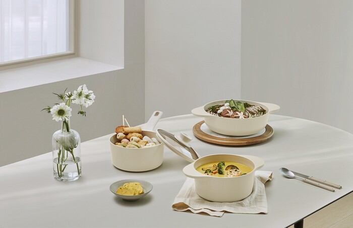 아이콘 세라믹 냄비는 오트 밀크와 유칼립투스 2가지 컬러로 출시되며, 알루미늄 통주물 소재를 적용해 견고함과 가벼움을 동시에 갖췄다. 테팔의 세라믹 논스틱 코팅 기술을 적용해 음식이 눌어붙지 않고 세척이 용이하며, 고온에서도 내열성과 긁힘에 강해 장기간 사용이 가능하다. 특히 산도와 염도가 높은 한식 요리에도 코팅 손상이 적어 실용성을 높였다.