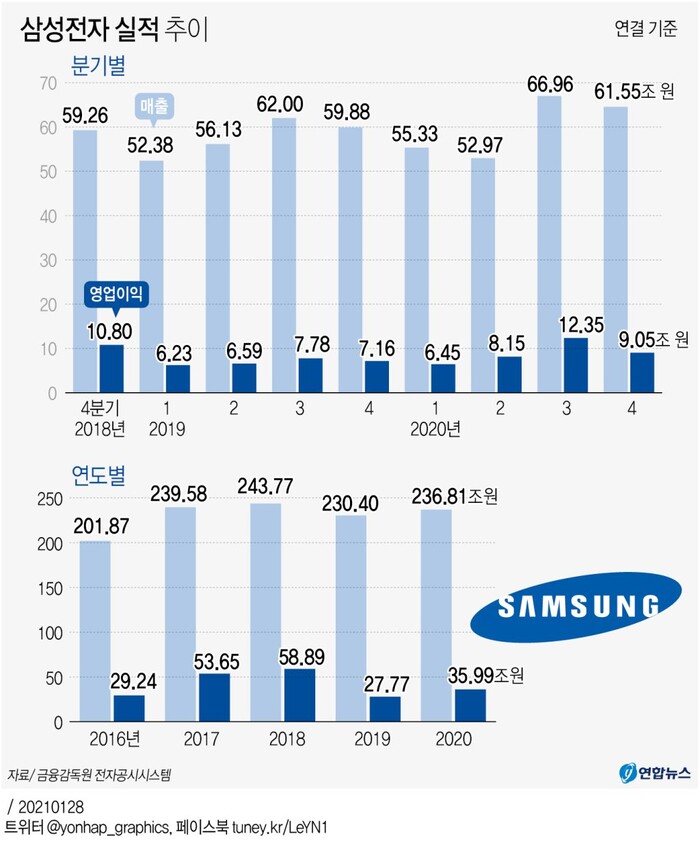 삼성전자는 지난해 연결 기준 잠정실적을 집계한 결과 영업이익이 35조9939억원으로 전년 대비 29.62% 증가했다고 28일 밝혔다. 연간 영업이익이 35조원을 넘어선 것은 2013년과 2017년, 2018년 이후 네번째다.