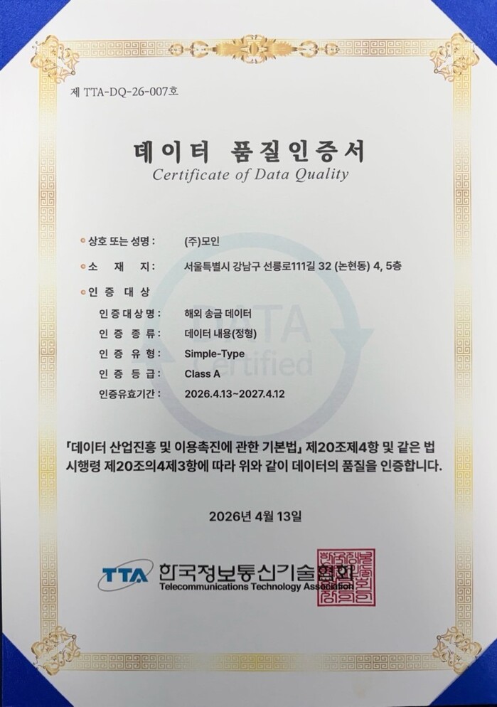 [메가경제=양대선 기자] 해외송금 핀테크 기업 모인이 한국정보통신기술협회(TTA)가 주관하는 데이터 품질인증(DQ 인증)에서 최고 등급인 ‘Class A’를 획득했다고 29일 밝혔다. 이번 품질인증은 서울경제진흥원(SBA)이 주관하는 ‘2025년 핀테크 기술사업화 지원 사업’ 수행의 일환으로 진행됐다. 모인은 해당 사업에서 활용되는 핵심 자산인 ‘해외송금 데이터’를 대상으로 인증을 의뢰했으며, 데이터의 정확성, 일관성, 유효성 등 엄격한 심사 기준을 모두 통과해 최고 수준의 데이터 품질을 인정받았다.