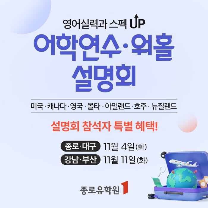[메가경제=양대선 기자] 유학전문기업 종로유학원이 ‘어학연수 & 워홀 설명회’를 오는 11월 4일 종로와 대구지사, 11월 11일 강남과 부산에서 각각 진행한다고 23일 밝혔다.