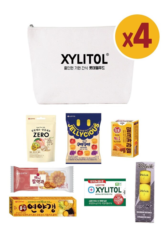 ‘Sweet Golf Box’는 간편하게 꺼내먹을 수 있고, 남녀노소가 모두 좋아하는 인기제품으로 구성되었다. 총 4개 셋트로 구성되었고, 구성품은 롯데웰푸드의 대표 간식인 자일리톨, 제로 후르츠젤리, 구미 당기는 구미, 밀크카라멜, 미니 쌀약과, 8곡 영양갱과 볼빅 3구 골프공, 그리고 롯데웰푸드에서 특별히 제작된 파우치가 들어있다.