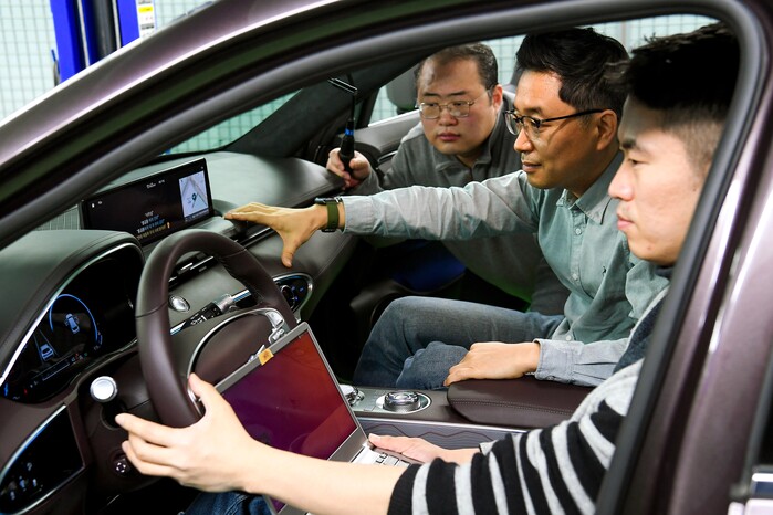 ▲ 현대자동차그룹 연구원들이 ‘커넥티드 카 인공지능 음성인식 기술’을 자동차에서 테스트하고 있다. [사진=현대차 제공] |