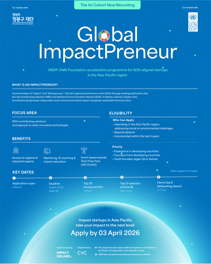 [메가경제=주영래 기자] 현대차 정몽구 재단과 UNDP 서울정책센터가 아시아태평양 지역 임팩트 기업가 육성에 나선다. 양 기관은 임팩트 비즈니스 전문기관 임팩트스퀘어와 함께 글로벌 액셀러레이션 프로그램 ‘글로벌 임팩트프러너(Global ImpactPreneur)’를 공식 출범하고, 4월 3일까지 1기 참가자를 모집한다고 3일 밝혔다.