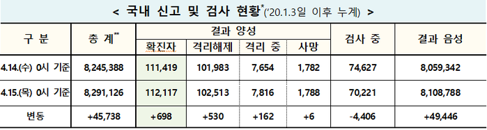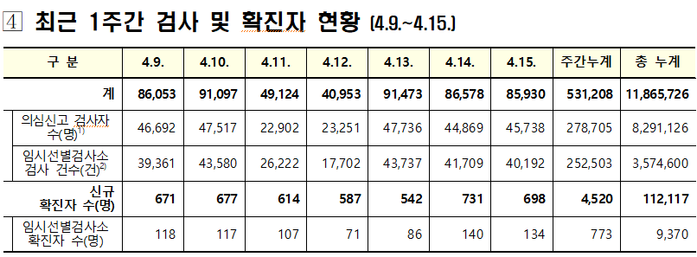 중앙방역대책본부는 15일 0시 기준으로 코로나19 신규 확진자가 698명 발생해 지금까지 누적 11만2117명으로 집계됐다고 밝혔다. 해외유입 누적 확진자는 7910명이다.
