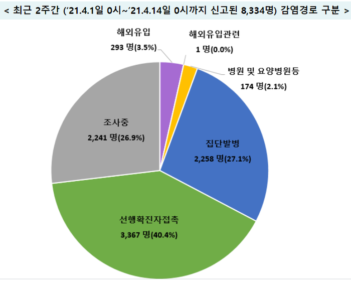 ▲ 지난 1일부터 14일까지 최근 2주간 감염경로 구분. [출처= 중앙방역대책본부] |