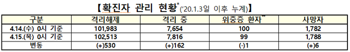 ▲ 15일 0시 기준 코로나19 확진자 관리 현황. [출처= 중앙방역대책본부] |