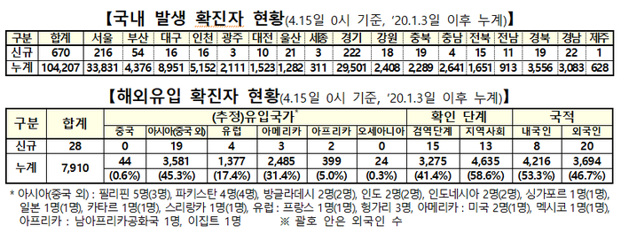 ▲ 15일 0시 기준 코로나19 국내발생 및 해외유입 확진자 현황. [출처= 중앙방역대책본부] |