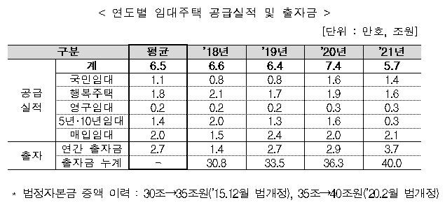 LH는 지난 2018년부터 연평균 6만 5000가구의 공공임대주택을 공급하면서 지난해 말 납입자본금 누계액이 총 39조 9994억 원에 달해 법정자본금인 40조 원에 근접했다.
