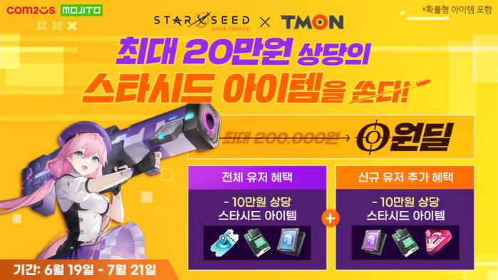 이벤트는 오는 7월 21일까지 진행된다. 먼저 티몬에서 ‘스타시드’ 쿠폰 0원딜을 열고 선착순 5만 명에게 10만 원 상당의 아이템을 무료로 제공한다. 쿠폰은 ▲마이닝 티켓 20장, ▲프록시안 모집권 10장, ▲SR 프록시안 영입권 10장 등으로 구성된다.