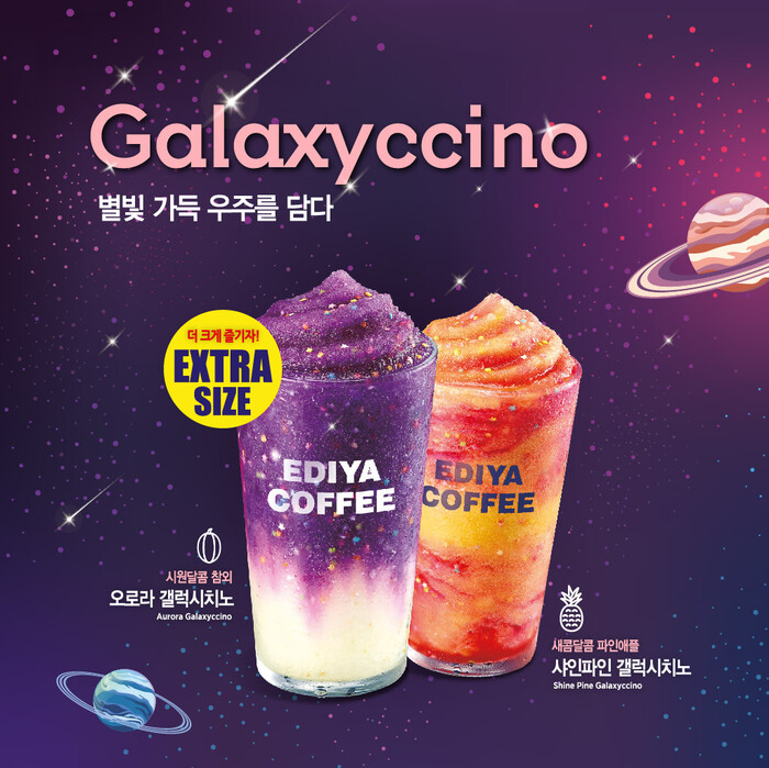 오로라 갤럭시치노는 밤하늘에 별이 떨어지는 듯한 비주얼의 보라색 음료로 참외의 청량함과 달콤한 맛을 즐길 수 있다. 샤인파인 갤럭시치노는 해변가의 붉은 석양을 보는 듯한 즐거움과 함께 새콤달콤한 파인애플 맛을 느낄 수 있다.
