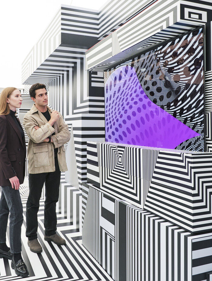 작품 내부에는 육면체를 쌓아올린 듯한 조형물을 설치하고 벽과 바닥, 조형물 전체를 흑백의 기하학적 패턴으로 감쌌다.