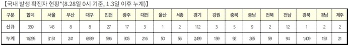국내발생자 359명을 지역별로 보면, 서울 145명, 경기 112명, 인천 27명으로 수도권 지역에서만 79.1%(284명)를 차지했다.