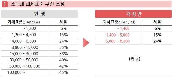 6% 세율이 적용되는 1200만원 이하 구간을 1400만원 이하로, 15% 세율이 적용되는 1200만~4600만원 이하 구간을 1400만~5천만원 이하로 각각 200만원, 400만원 올린다.