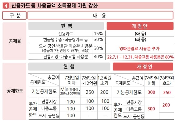 신용카드등 사용금액에 대한 소득공제의 적용기한을 3년 연장하고, 전통시장과 대중교통, 도서·공연 등으로 각각 한도를 설정하는 신용카드 소득공제는 총급여 7천만원 이하는 300만원, 7천만원 초과는 200만원으로 한도를 통합하기로 했다.