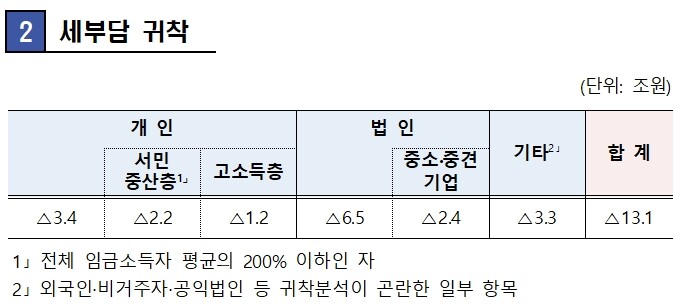 개인의 세수 감소 효과는 3조4천억원으로 서민·중산층이 2조2천억원, 고소득층이 1조2천억원이다.