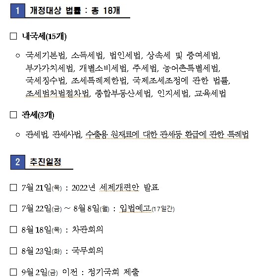 ▲ 2022년 세제개편안 추진일정. [기획재정부 제공] |