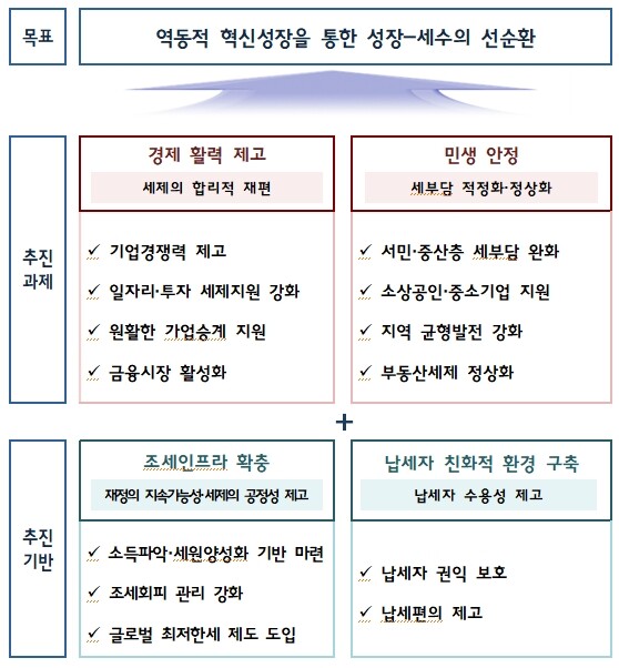 세금을 정책 수단으로 활용했던 이전 정부와 달리, 기업을 비롯한 민간 경제주체가 조세원칙에 맞게 ‘소득에 맞는 세금’을 내며 경제활동의 효율성을 높일 수 있도록 세법을 바꾸겠다는 방침이다.