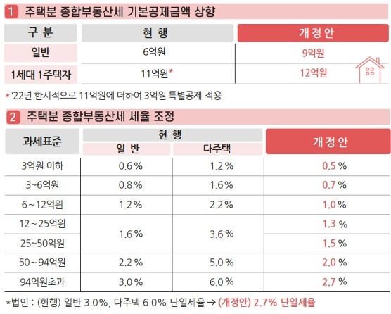 ◆ 종부세, 다주택자 최고세율 6.0%→2.7%로 인하…법인도 2.7% 단일세율