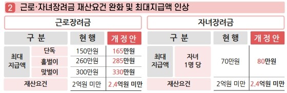 근로·자녀장려금은 지급 시 적용하는 재산 요건을 기존 2억원 미만에서 2억4천만원 미만으로 올리고 최대지급액은 10% 수준으로 인상하기로 했다.