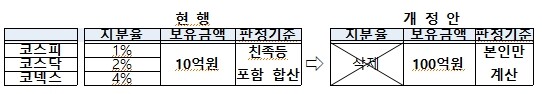 일정 지분율(코스피 1%·코스닥 2%) 이상 지분을 보유한 투자자를 대주주로 분류하는 지분율 기준 요건은 삭제한다. 대주주 판정 기준은 기타 주주 합산과세에서 본인 인별 과세로 전환한다.