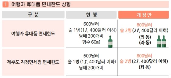 여행자 휴대품 면세한도는 기존 600달러에서 800달러로, 술은 1병에서 2병으로 늘어난다.
