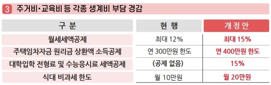 주거비 부담 완화 차원에서 월세 세액 공제율은 기존 최대 12%에서 15%로 상향한다. 주택임차자금 원리금 상환액 소득공제 한도도 300만원에서 400만원으로 늘린다.