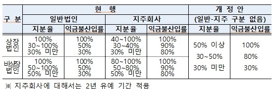 내년부터는 일반법인과 지주회사, 상장 여부와 관계없이 지분율 50% 이상은 100%, 30∼50%는 80%, 30% 미만은 30%로 익금불산입률을 적용한다.