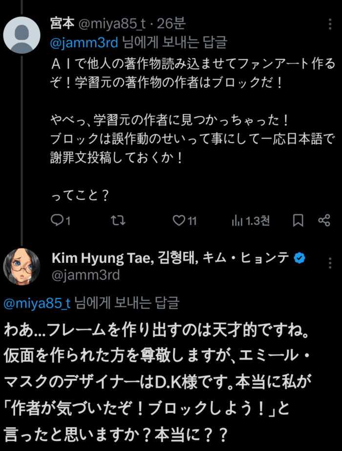 문제를 제기한 탈 디자인 오프라인 창작자 요시가 "AI로 제작된 것 아니냐"는 취지의 댓글을 남긴 이후, 김 대표가 해당 계정을 차단했다는 사실이 알려지면서 비판 여론은 더욱 거세졌다.