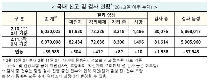 중앙방역대책본부(방대본)에 따르면 이날 0시 기준으로 신규 확진자 수가 504명이 늘어 지금까지 누적 확진자 수는 8만 2434명(해외유입 6640명)이다.