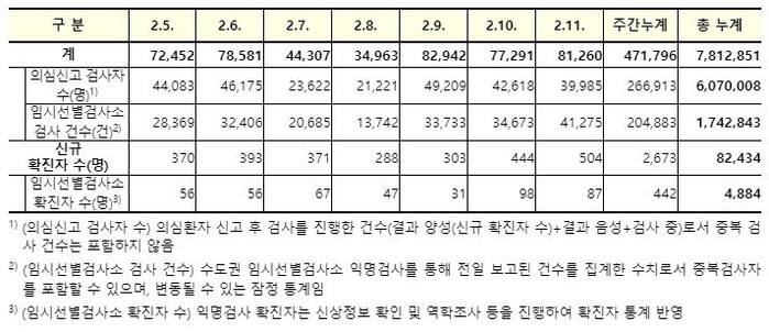 ▲ 최근 1주간 검사 및 확진자 현황 [출처= 중앙방역대책본부] |